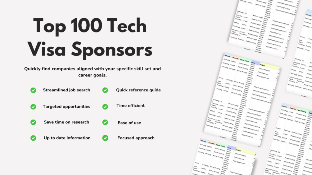 You'll receive an exclusive, downloadable list featuring 100 tech companies in the UK that offer visa sponsorship